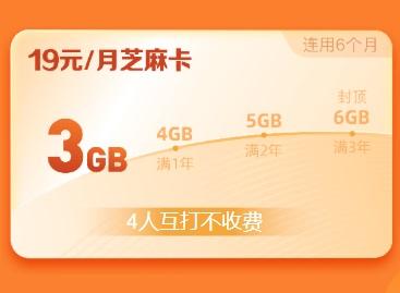 19元/月芝麻卡套餐内包括3GB国内通用流量(通用流量每年增加1GB,6GB封顶)、任选3个App定向免流量,以及咪咕视频、咪咕直播、咪咕音乐等App免流,可免费设置3个移动号码为亲情号,4人互打不收费。