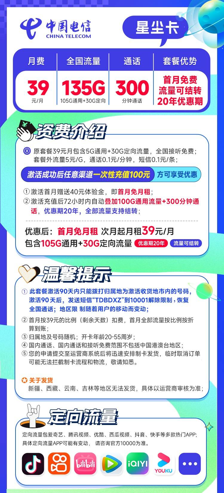 电信星辰卡 39元135G+300分钟通话丨20-55岁申请