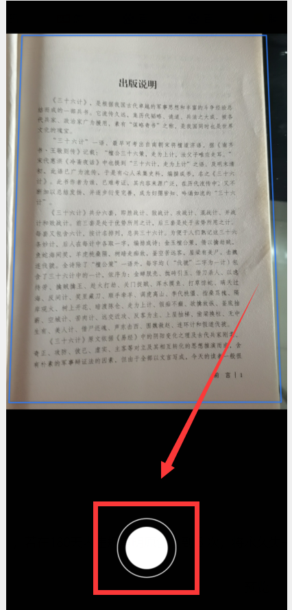 我们点击“文档扫描”选项,就会进入备忘录的扫描界面(如下图),把手机的相机对准我们要扫描的书,下图中的蓝色边框对准书本的书页,把需要扫描的文字包括在蓝色边框的里面(如下图)。