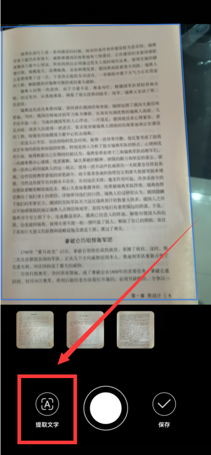 然后点击底部的拍照按钮,就会把书本文字暂存为一个图片。我们可以连续拍摄多张,一直把书本的所有页面都扫描完成。我在这里连续拍摄了3张书面(如下图)。