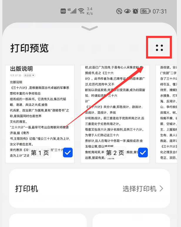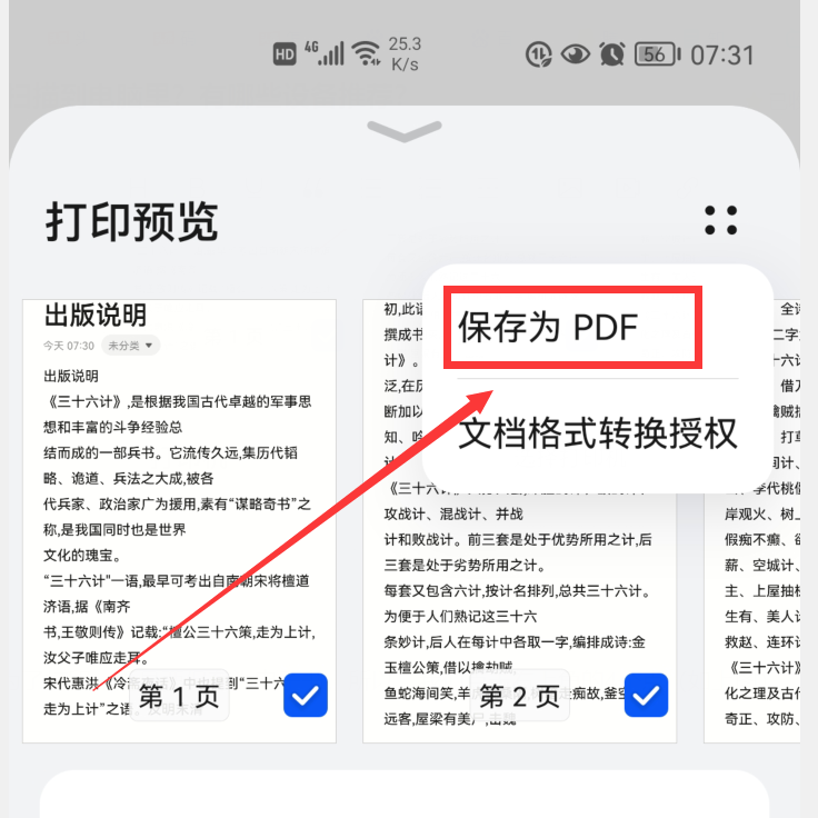 我们不是为了打印,而是要保存为电子书,所以,我们点击右上角的4个点(如上图),就会弹出一个小弹窗,有2个选项:保存为PDF、文档格式转换授权。