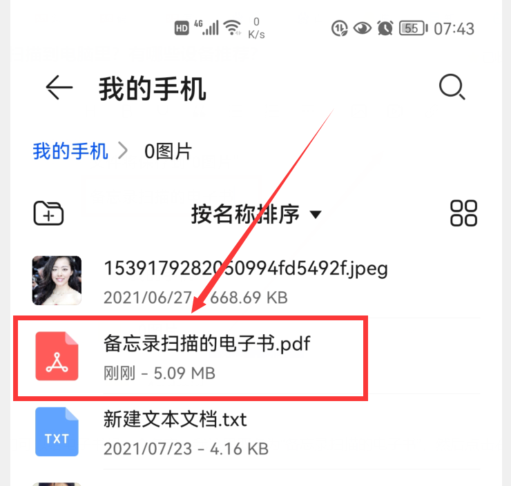 在这个文件夹,我们就可以看到一个“备忘录扫描的电子书”的PDF文件(如上图),这就是我们刚刚扫描完成的电子书,打开它就可以直接浏览,也可以把它拷贝到电脑、平板或其它手机上观看。