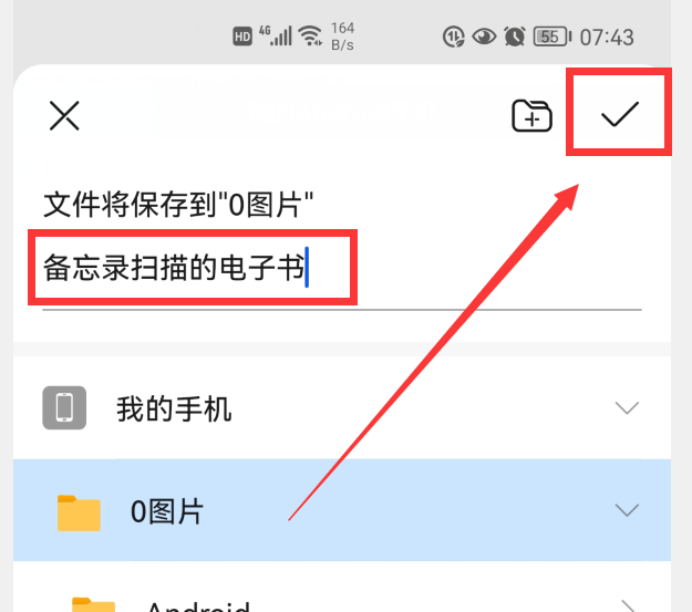 这里,我们可以给电子书起一个名字,我这里取名为“备忘录扫描的电子书”,然后点击右上角的对号,就把这个电子书保存到手机的文件夹里了。