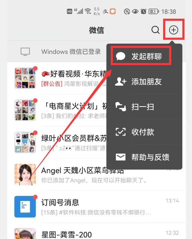 打开微信,点击微信首页右上角的加号按钮,就会弹出下拉菜单(如下图)。