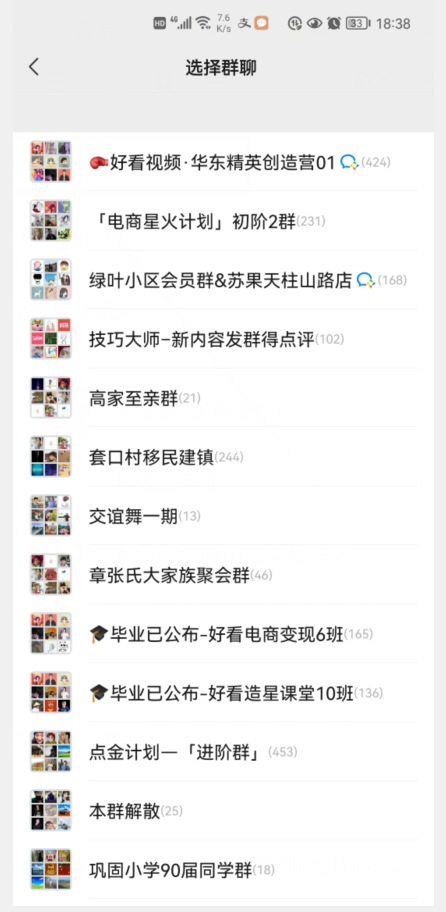 点击“选择一个群”选项,屏幕上就会显示你加入的所有微信群聊(如下图)。