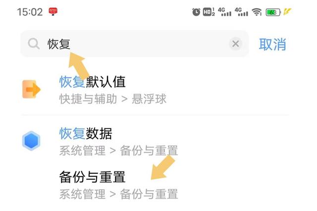点击“设置”选项内的“搜索对话框”,输入“恢复”两个字,在搜索结果里选择“备份与重置。如下图: