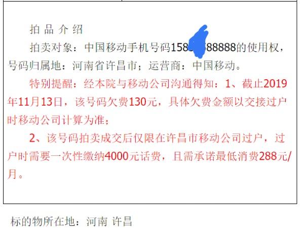 一个移动手机号码158XXX88888的使用权。评估价138000,起拍价:96600元 保证金:10000元,增加幅度:1000.00元(以及其整倍数)。