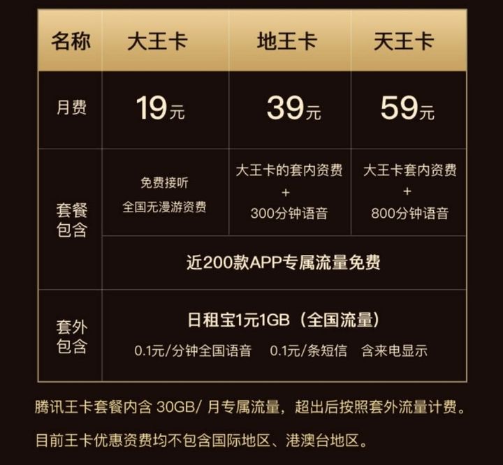 1、腾讯王卡19元/月,30G专属流量+百款应用