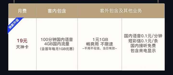 2、新天神卡19元/月