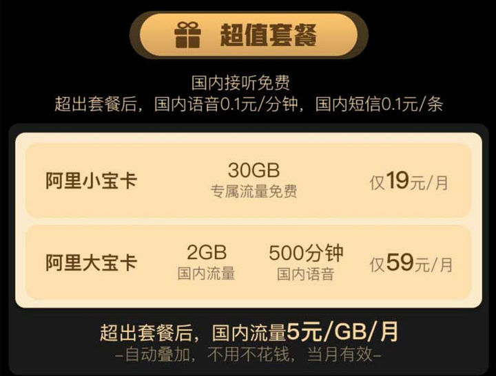 3、阿里宝卡19元/月,阿里系免流+国内1G流量+100分钟