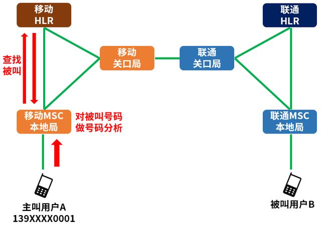 当我们使用移动的手机号码拨打电话给移动的号码时,我们本地区域的核心网络设备“移动交换中心(MSC)”会根据设定好的规则去移动自己的“归属寄存器(HLR,存放移动用户的基础数据和信息)”查找。这里请注意HLR可能是一个地区一个,而不是一个国家用一个,只有地区查询不到的时候才会往上级HLR查询,这样的分层分布式结构才能保证通话的快速接通。