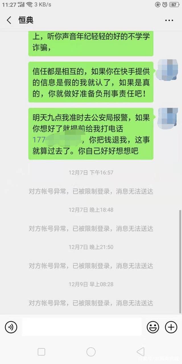 爆料网友发现自己上当,于是要求退钱,但对方始终不做正面回应,爆料网友找到快手平台客服投诉,但出于对用户隐私的保护,客服回应必须通过报案后方可向警方提供。“我找过辖区所属的东金庄派出所报警,但由于数额过小,所以民警没有立案。”爆料网友称,目前这个贩卖手机号的主播已在快手平台将其拉黑,微信账号也显示存在异常禁止登陆:“只能当作花钱买教训了,也希望给大家提个醒,通过网络购买商品时一定要擦亮眼。”