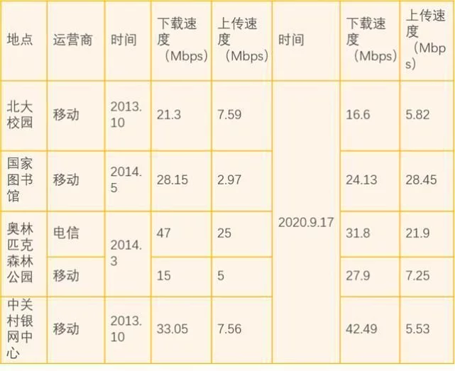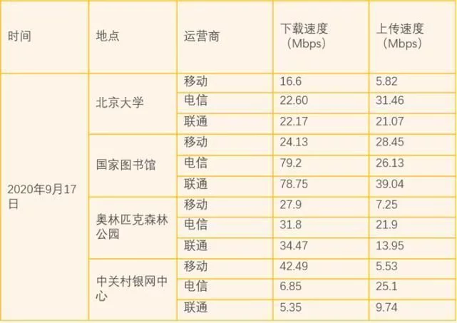 从测试结果可以看出,同一运营商在不同地点的4G网络速度差异明显。例如,国家图书馆电信4G下载速度为79.2Mbps,而中关村银行网络中心的4G下载速度仅为6.85mbps。这远远低于中国4G移动带宽的平均下载速率。根据《2019年第三季度中国宽带速率报告》,中国移动宽带用户使用4G网络上网时的平均之下载速率达到24.02mbps。
