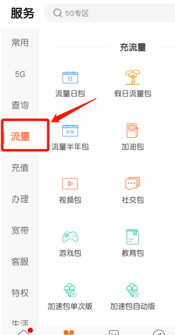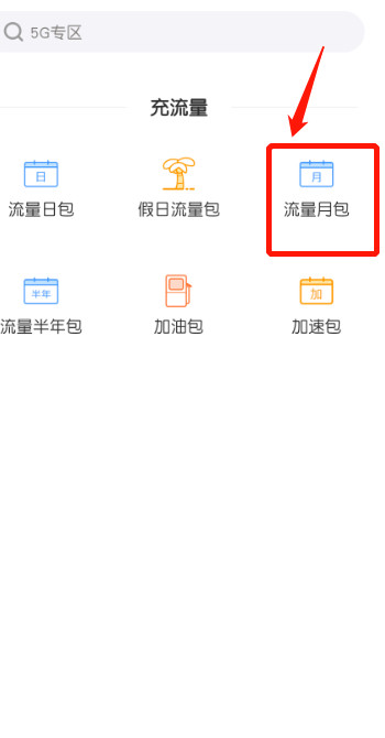 4、选择需要订购的流量包服务,例如选择“流量月包”。