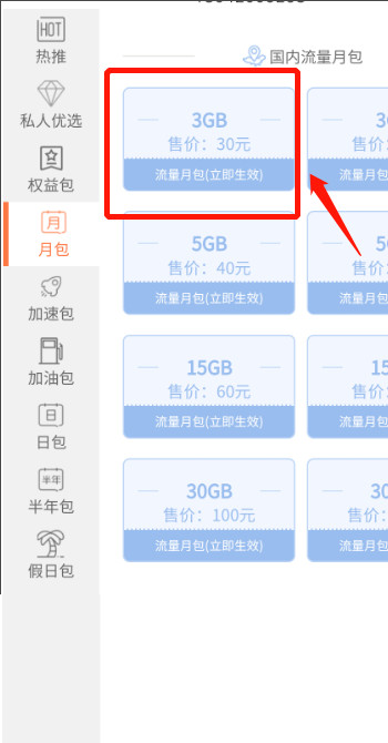 5、选择某一种类国内流量月包,例如选择3GB选项。