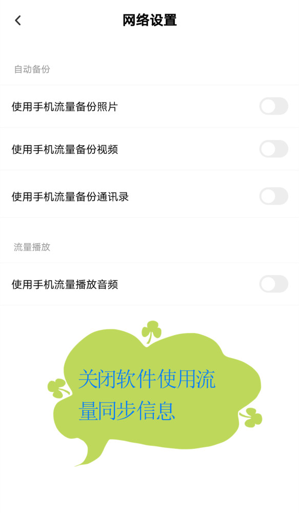 很多软件都会向后台同步我们的数据,特别是网盘这种专门给我们备份数据的软件。每进行一次数据同步,就会用去我们少则几个GB,多则几十个GB的流量。关闭软件使用流量同步信息,等到有WiFi了再同步,可以帮我们节约下一笔不少的流量。