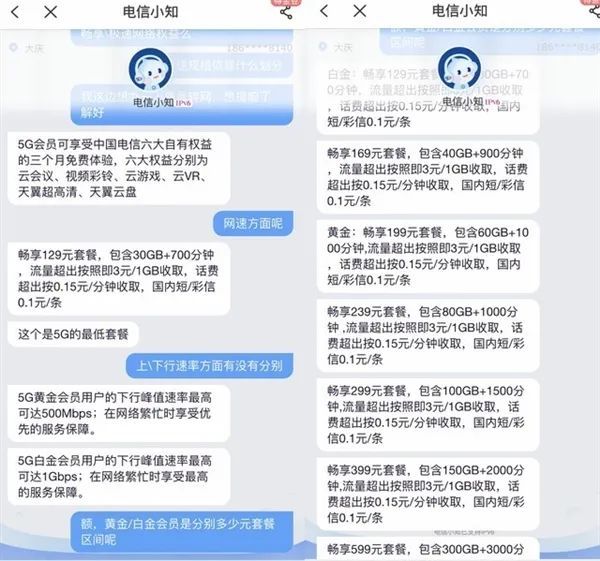 若用户需要更高的下行速率则需要更换至199元以上的套餐,后者可享受5G极速权益,即最高1Gbps的下行速率,电信方面也是如此。