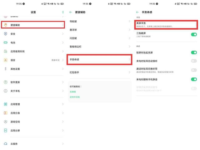 设置步骤:「 设置 – 便捷辅助 – 手势体感 – 黑屏手势」这样一来我们单手也可以快速启动我们想要的功能。