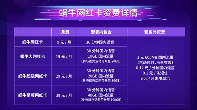 为满足不同用户的使用需求,蜗牛移动还有多款网红卡套餐供用户选择。网红卡,月费9元,含30分钟通话;大网红卡,月费19元,含10GB流量+30分钟通话(参与首充活动,套餐内流量可升至20GB);超级网红卡,月费29元,含20GB流量+30分钟通话(参与首充活动,套餐内流量可升至30GB)。
