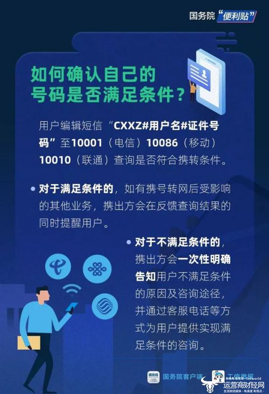 ①查询携转条件:携出手机发送短信“CXXZ#客户姓名#证件号码”至电信10001查询。