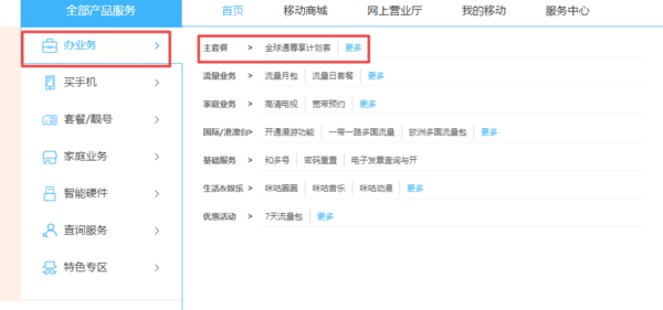 1.可以登录中国移动官网,点击左侧“办业务”——“主套餐”,根据提示操作;