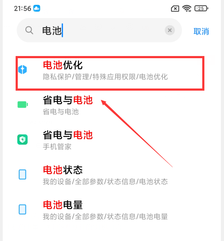在搜索框中输入“电池”,就可以找到“电池优化”。