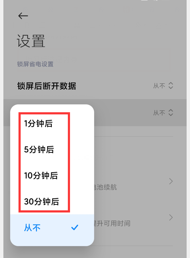 然后点击右上角的设置按钮(如上图),进入省电设置界面(如下图)。