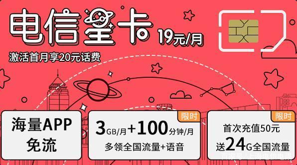 电信19元星卡,依然是200G的流量,200G=各类通用流量+定向流量,用到200G就自动断网。现在办理星卡,每月赠送3GB国内通用流量和100分钟国内语音,连续赠送12个月;激活首月赠送20元话费;在指定的充值页面,首次充值50元送24G通用流量(每月2GB,连续送12个月)。