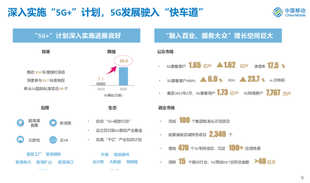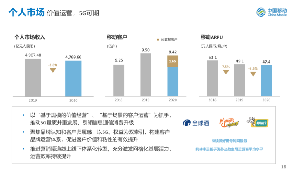 日前,中国移动披露了2020年业绩数据,从报告中不难看出,中国移动依然坚定不移地建设、发展5G,推进数智化转型。
