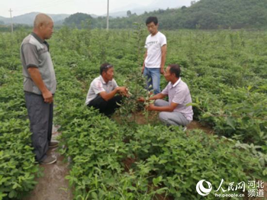 中国电信承德分公司驻村扶贫人员与专家研究如何去虫害。