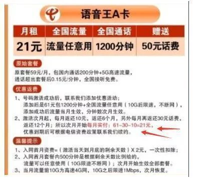 如图所示,电信的这款名叫“语音王A卡”的每月月租为21元,套餐中不仅包含了1200分钟的国内主叫语音通话时长,全国流量任意用,而且还赠送50元的话费,可谓是良心至极,相信电信推出这款套餐自己也是大大的出血了。不过还是有两点需要注意的是,第一图片上虽然说月租是21元,其实从第六个月起月租就会上调至31元,使用超过12个月后,月租就会恢复原价61元,到时来看,性价比就不怎么高了,不过图片中也表示优惠到期后还是可以再次续约的。第二需要注意的是,虽然说是国内流量任意用,其实每个月只有前10个G为不限速流量,当月流量使用超过10G之后,网速就会限制于1Mbps,次月才会再次恢复。