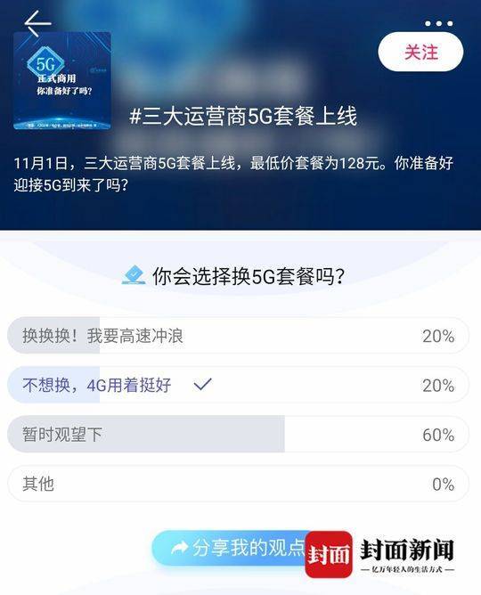 5G套餐发布之后,封面新闻也在青蕉社区上发起了“你会选择换5G套餐吗?”的投票,投票数据显示,20%的用户选择更换5G套餐,20%的用户选择仍然使用4G网络,剩下60%的用户则选择了暂时观望。