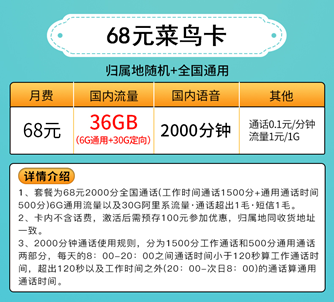 68元月租= 6G国内通用流量+30G定向流量+500分钟语音通话+1500分钟工作时间通话(每日8:00-20:00)