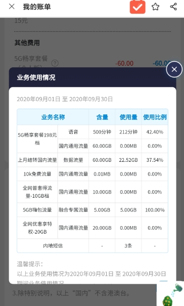 “流量根本用不完,每月也打不了那么多电话,这个套餐感觉有点浪费。”肖先生称,“9月账单显示,上月结转流量为60G,当月使用量只有22.52G,那个月500分钟通话也只用了212分钟。”