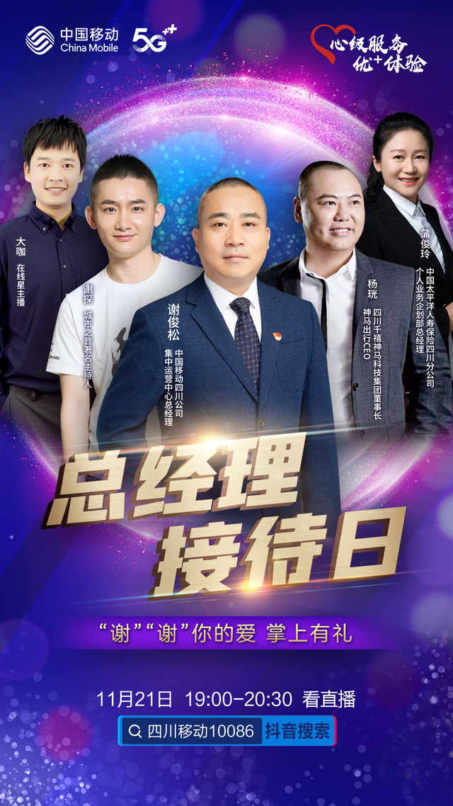 11月21日晚19:00-20:30,四川移动11月总经理接待日直播间,重磅嘉宾坐镇,精品好礼相送,风里雨里我们等着你!直播将在“中国移动APP、10086APP、四川移动掌上营业厅、四川移动10086抖音号、四川移动抖音号、封面新闻APP、今日头条APP、封面新闻抖音号”等渠道同步上线,敬请关注!