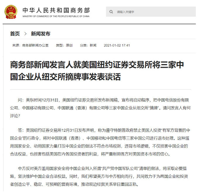 问:美东时间12月31日,美国纽约证券交易所发布新闻稿,宣布将启动程序,把中国电信股份有限公司、中国移动有限公司、中国联通(香港)有限公司等三家中国企业从纽交所“摘牌”。请问发言人有何评论?