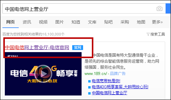 一、首先打开浏览器,在浏览器里输入“中国电信网上营业厅”然后搜索,在搜索到的链接里点击后面有官网字样的链接。