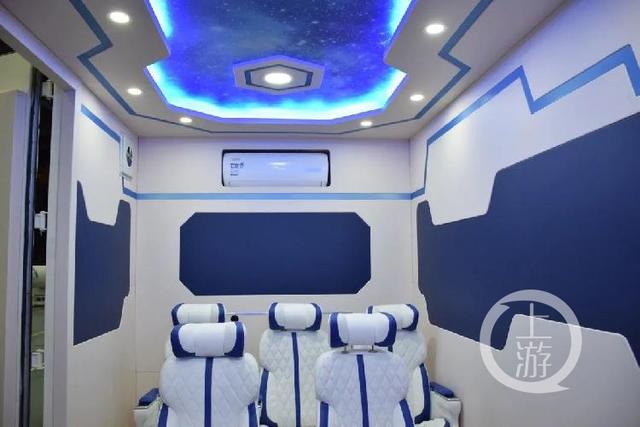 方舱整体设计简洁大气,将现代时尚感与硬核科技设计文化完美结合。另外,为了给舱内的技术人员和观众提供更好的视觉体验,实现多个角度的观察和操作功能,特意将移动测发控方舱的座椅布置采用5+3模式,并在方舱内壁上嵌入安装超宽屏幕,并将显示屏面向观众席倾斜10度,最大程度上保证观看效果、方便技术人员操作。