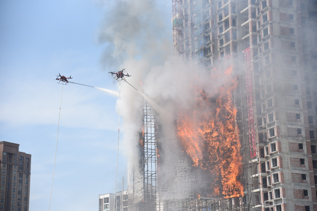 5G网联消防无人机参与实战演练,正在扑灭高层明火