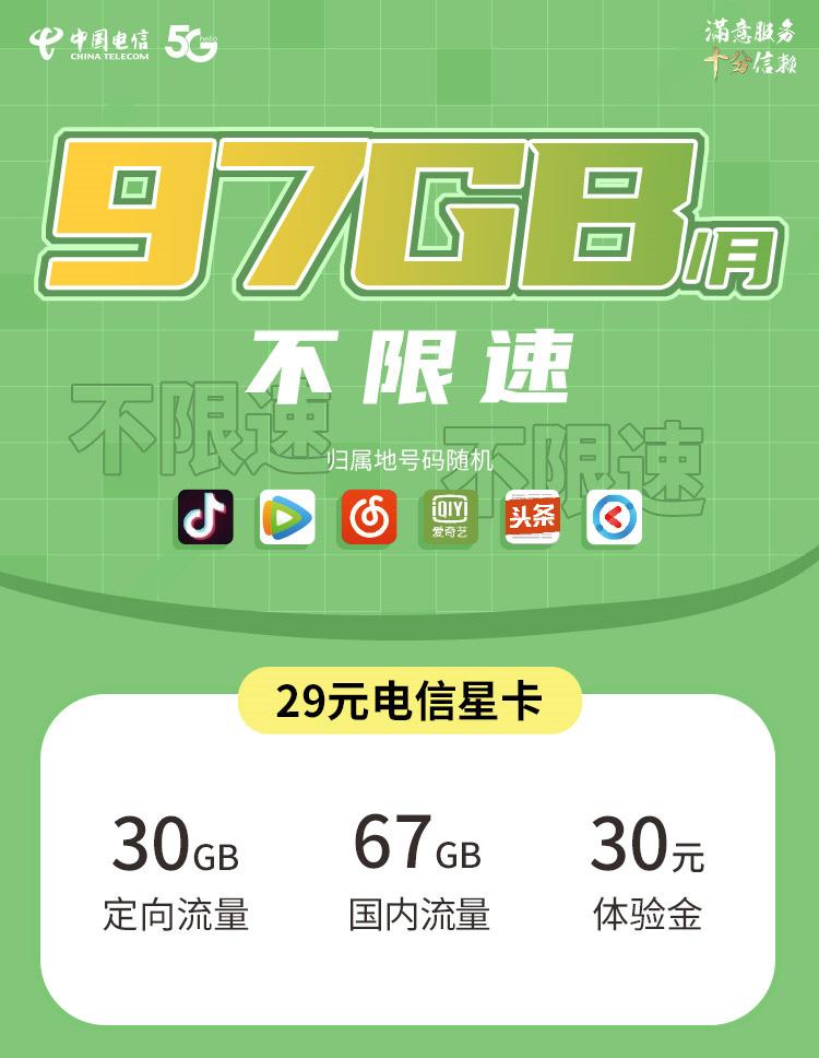 29元/月=67GB国内流量+30GB定向流量
