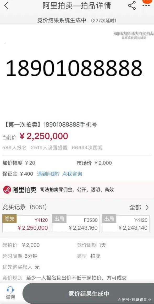近日,在某拍卖平台进行司法拍卖的一部尾号为5个“8”的手机靓号,经过经过5051次出价、227次延时之后,最终以225万元的价格落槌成交。