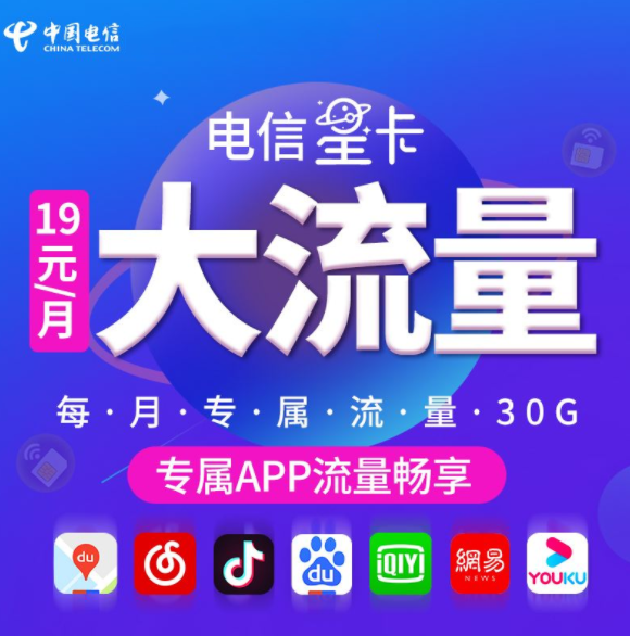 手机卡19月租,套餐内百度系、网易系、阿里云,阿里系、头条系,腾讯视频、快手几十款APP定向流量30G/月: