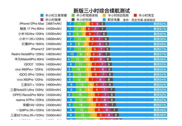 我们可以看到iPhone12proMax的电池容量只有3687,比在此的安卓机电池容量都要小,但续航却是最出色的,秒杀一众安卓机,不得不说苹果的A14芯片以及ios系统是真的省电。