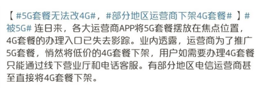 有舆论认为,这是三大运营商为了推广5G业务在收紧4G业务。
