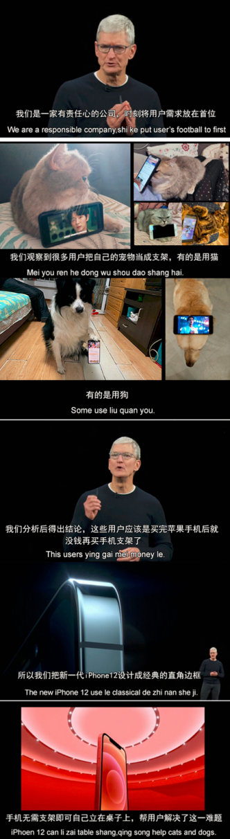 第二个吐槽的点是iPhone终于支持的5G,比如“库克”在发布会上还隆重宣布——乡亲们,我们终于支持超级超级先进、网速超快超快的5G啦!