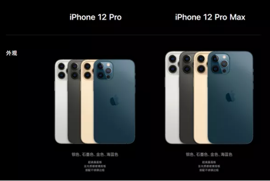 iPhone 12 Pro和iPhone 12 Pro Max有四款颜色:海蓝色、金色、石墨色和银色。这个系列的海军蓝和iPhone 12的蓝色相比,显得更加有磨砂感。