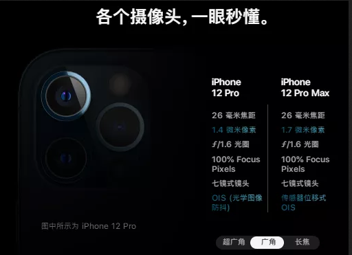 iPhone 12 Pro是1200万像素超广角、1200万像素广角和1200万像素长焦组成的三摄+LiDAR,全新7P镜片的广角,f/1.6,52mm 焦距长焦,整套系统可提供四倍光学变焦。而Pro Max在Pro的基础上,是65mm焦距长焦,整套系统可提供五倍光学变焦。