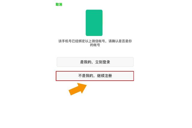 答案是“解绑”,不要管手机号是否绑定了微信号,只要手机号在自己的手里,且可以正常接发短信,那么就强制解绑即可,不管注册,还是换绑,掌握手机号的用户有绝对的处置权,平台也提供了强制解绑、换绑的渠道和方法,尤其是注册微信号时,如果提示已经绑定了微信号,直接选择“不是我的,继续注册“即可。如下图: