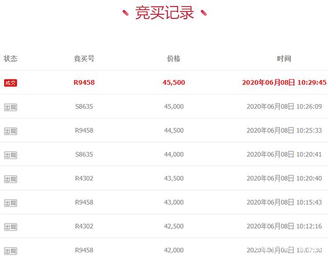 用户姓名乔巧通过竞买号R9458于2020年06月08日在新丰县人民法院于阿里拍卖平台开展的“一个中国移动手机号码158XXXX3888”项目公开竞价中,以最高应价胜出。