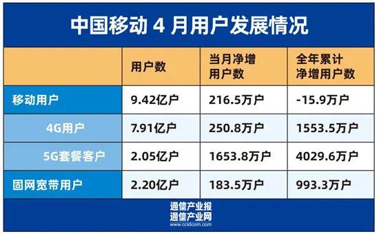 截至4月底,中国移动的移动用户数为9.42亿,单月净增216.5万。但是,由于今年前两个月用户净流出数较大,导致截至4月底,中国移动的移动用户数今年累计净增仍为负,为-15.9万户,不过净减数明显减少。
